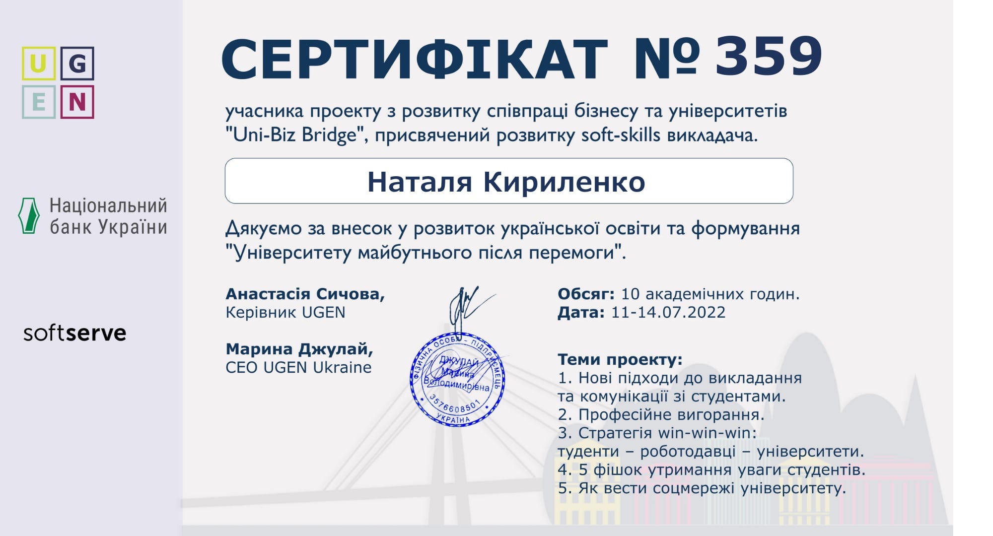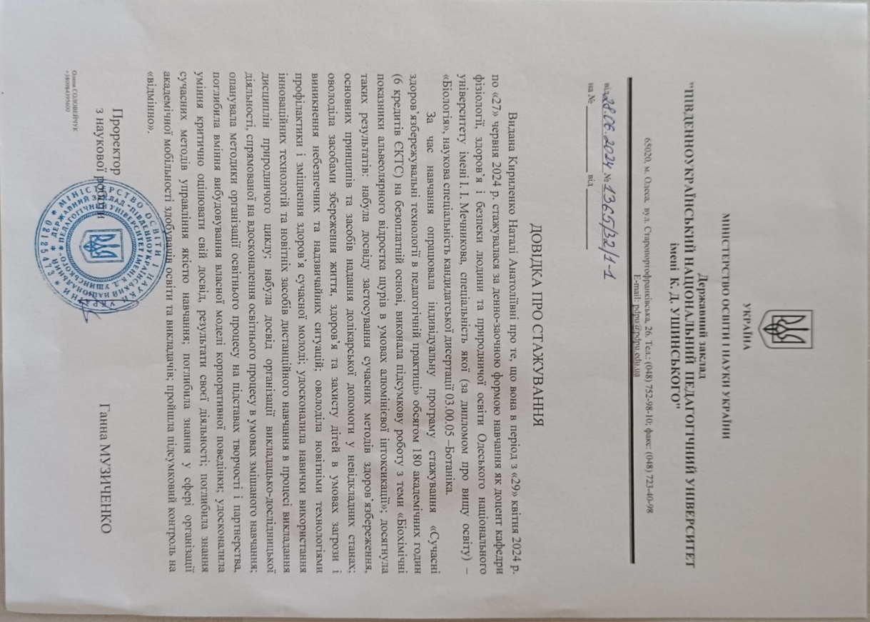 - Фізіологія ЦНС і гігієна розумової діяльності (014.05 Середня освіта (Біологія та здоров'я людини), І рівень вищої освіти).