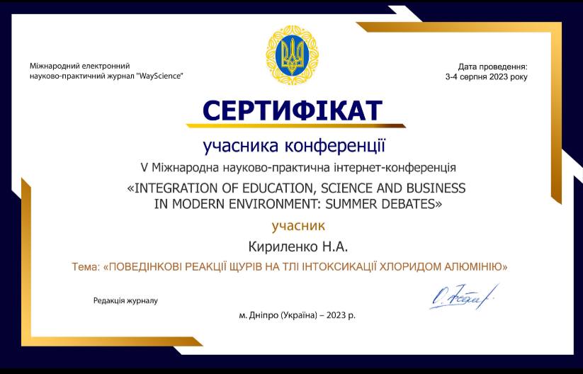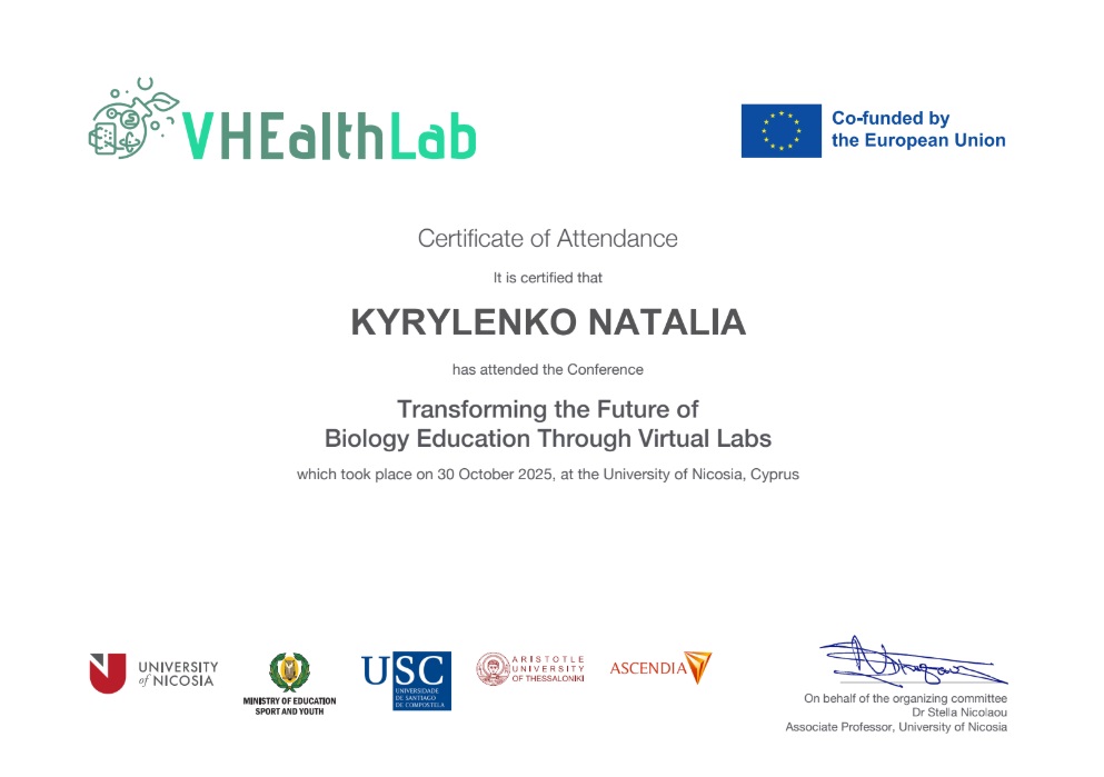 - «Фізіологія ВНС» (Спеціальності: 091 «Біологія», 014.05 Середня освіта (Біологія та здоров'я людини), 162 Біотехнології і біоінженерія, 206 Садово-паркове господарство, І рівень вищої освіти).