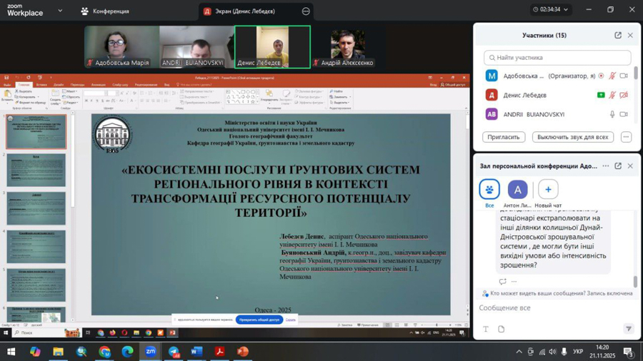 21-22 листопада 2025 року відбулася ІІІ Всеукраїнська наукова конференція молодих вчених «ҐРУНТОВО-ЗЕМЕЛЬНІ РЕСУРСИ УКРАЇНИ», яка проходила на базі геолого-географічного факультету ОНУ у змішаному форматі. У роботі конференції взяли участь аспіранти, докторанти, молоді вчені, здобувачі вищої освіти, представники наукових установ і закладів вищої освіти різних регіонів України, аграрії, представники органів місцевого самоврядування, практики водного і сільського господарства, екологи, громадські активісти.
